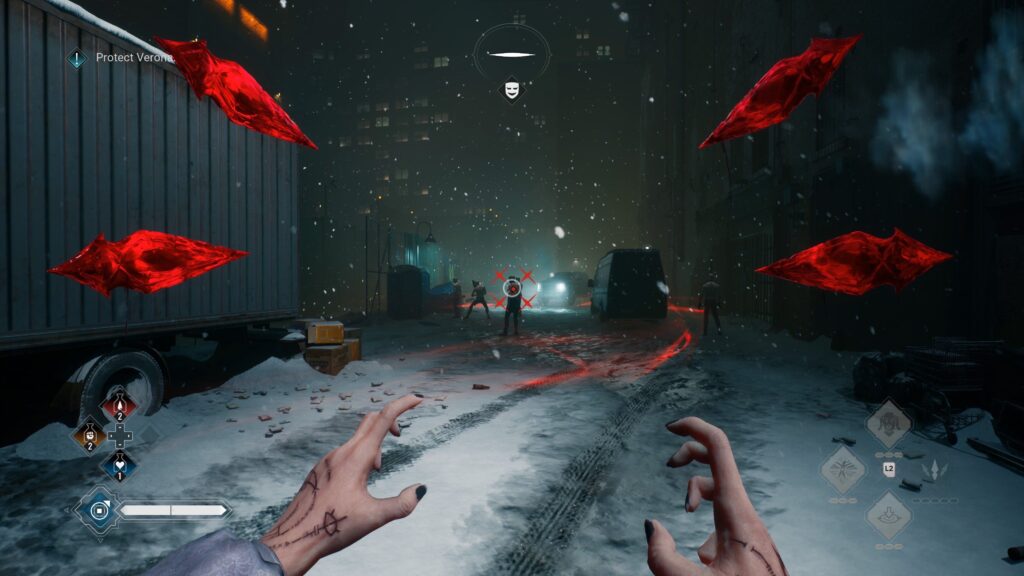 Tu pa igra res pade. Tudi po popravkih ima Bloodlines 2 še vedno kar nekaj težav. Na PS5 mi je večkrat padla slična hitrost, posebej v notranjih prostorih ali med bojem. Par krat se mi je igra kar sesula in vrnila na začetni zaslon. Poleg tega se dogaja, da NPC-ji stojijo v zraku, zmrznejo sredi animacije ali izginejo iz prostora. Takšne stvari res kvarijo izkušnjo, sploh pri igri, ki želi biti pripovedno poglobljena.